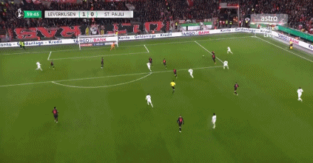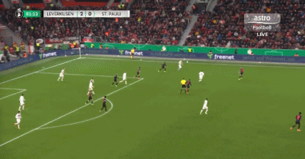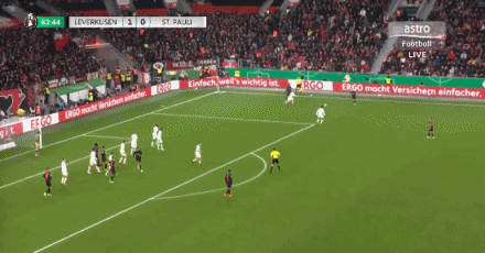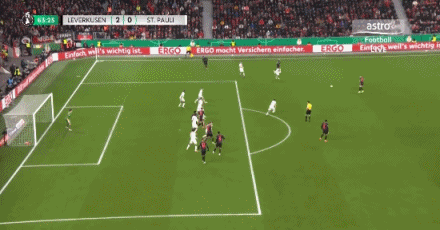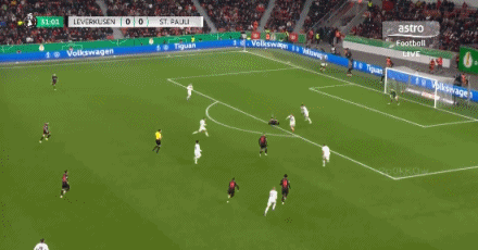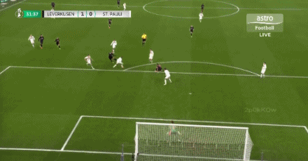 第31分鐘,泰里耶凌空抽射,皮球直掛死角,勒沃庫森1-0圣保利