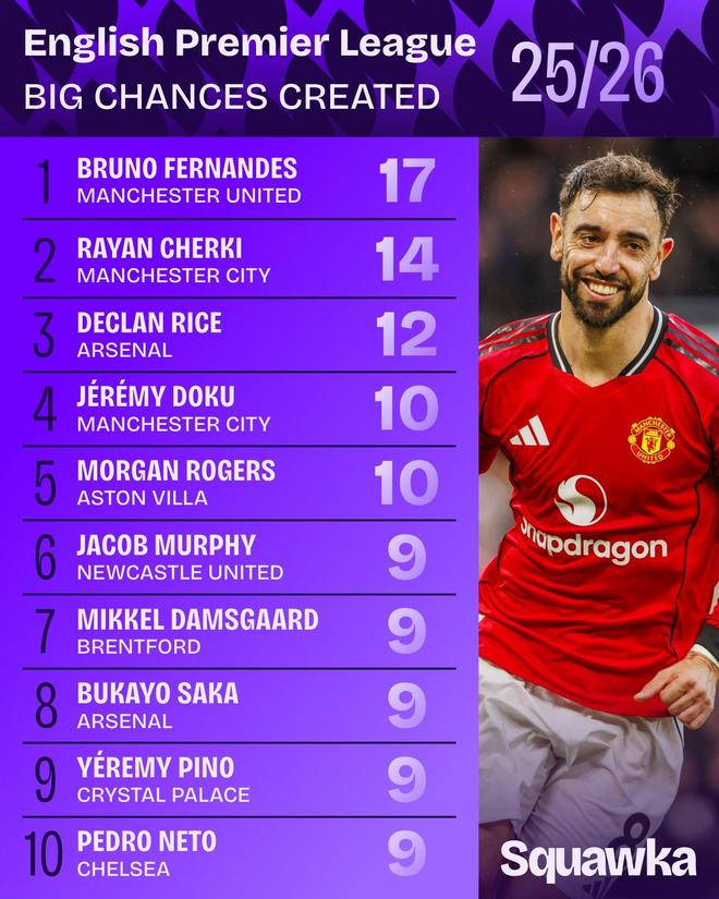 據(jù)足球數(shù)據(jù)網(wǎng)站Squawka的統(tǒng)計,本賽季至今,布魯諾-費爾南德斯在英超已創(chuàng)造17次重大機會,領(lǐng)跑榜單,謝爾基14次、賴斯12次分別排在第二、第三名。