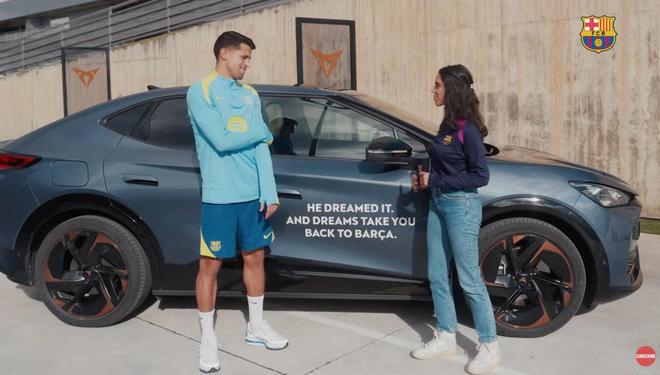我們現(xiàn)在坐在一輛CUPRA里,這很特別,因?yàn)檐嚿嫌幸痪鋵iT為你準(zhǔn)備的貼紙。如果你愿意,可以對(duì)著巴薩球迷大聲讀出來。